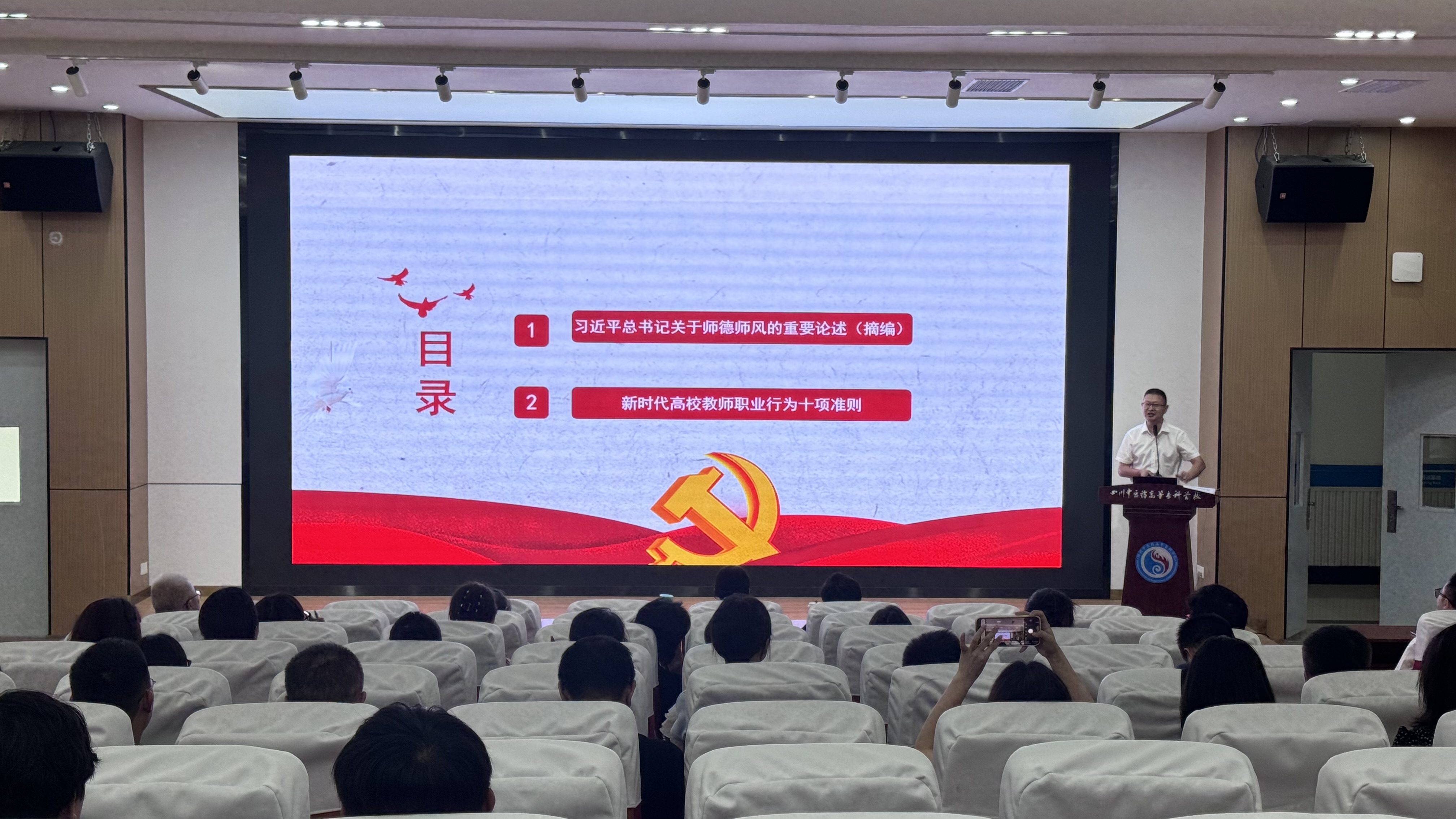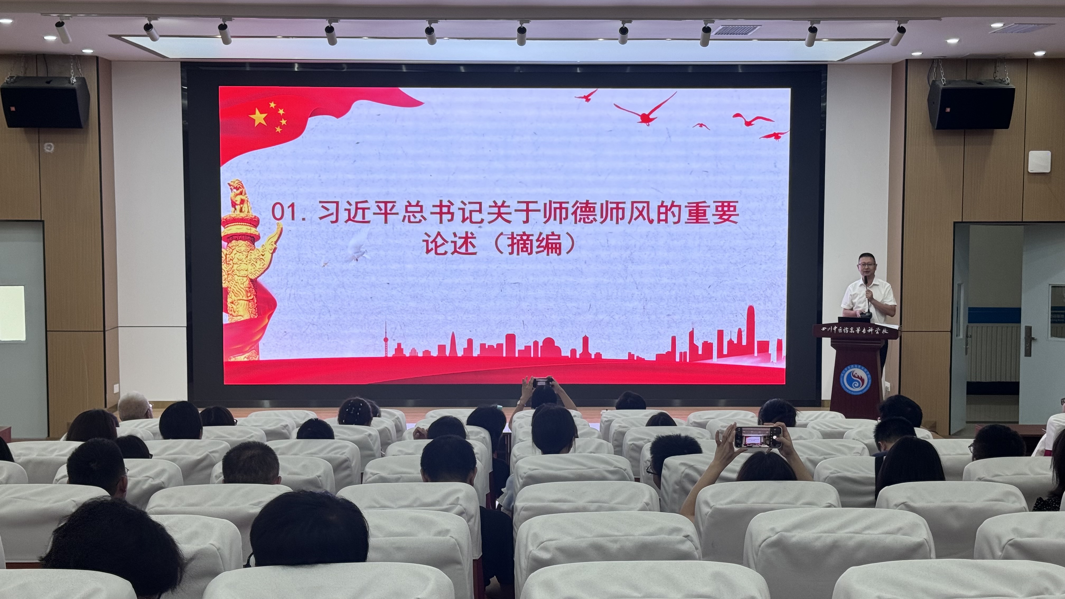 为深入贯彻落实习近平总书记关于师德师风的重要论述(摘编),不断加强教师队伍师德师风建设,引导广大教师坚定理想信念,陶冶道德情操,切实规范教师从教行为,营造风清气正的育人环境。2024年7月25日上午,我院组织全体教师及辅导员在北区1教学术报告厅开展“2024上半年师德师风专题培训学习”。本次会议由学院党总支书记任植艺同志作会议培训主讲人。