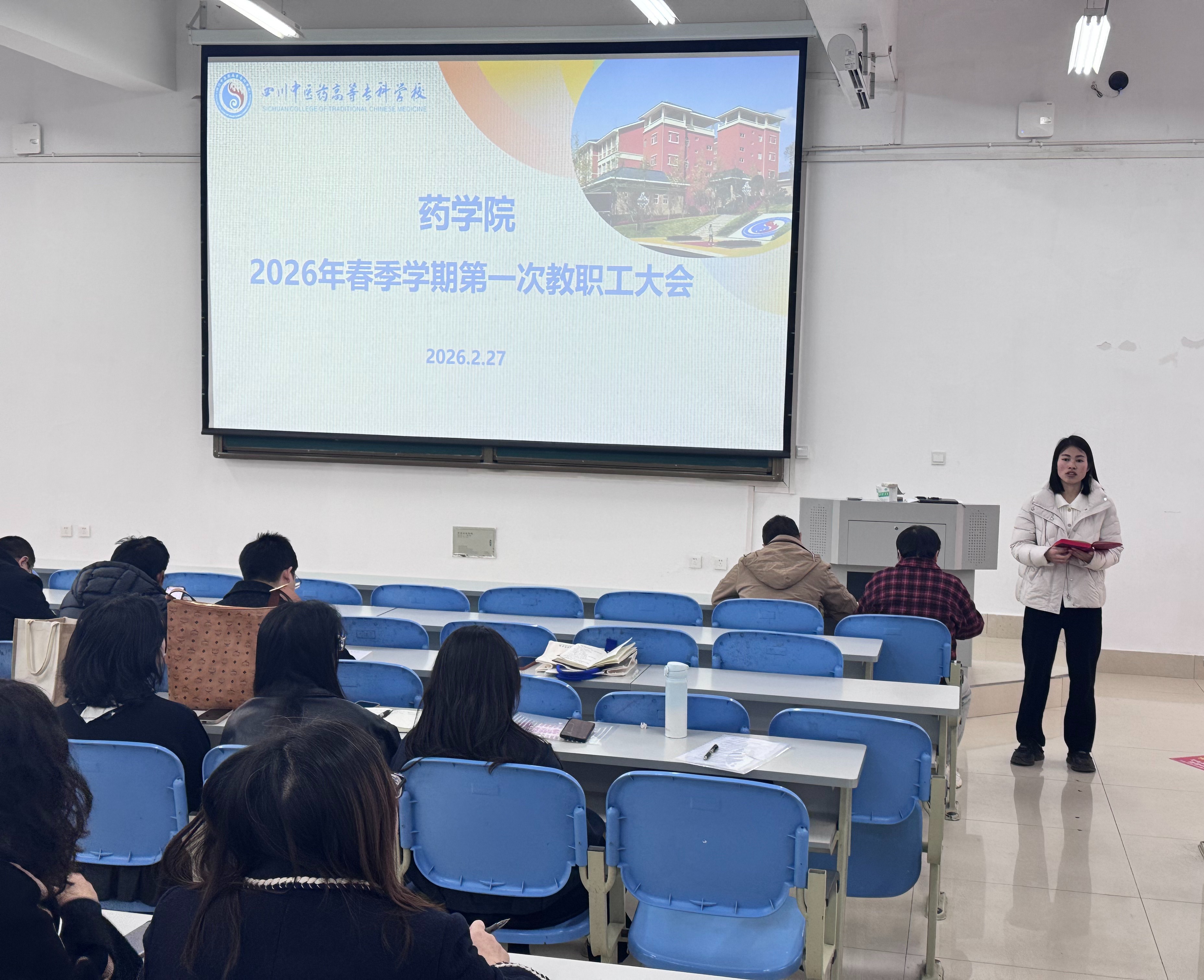 春回大地,万象更新。2月27日,我院召开2026年度第一次教职工大会。会议由袁文院长主持,院党总支书记任植艺、党总支副书记孔丽出席,全体教职工参加会议。