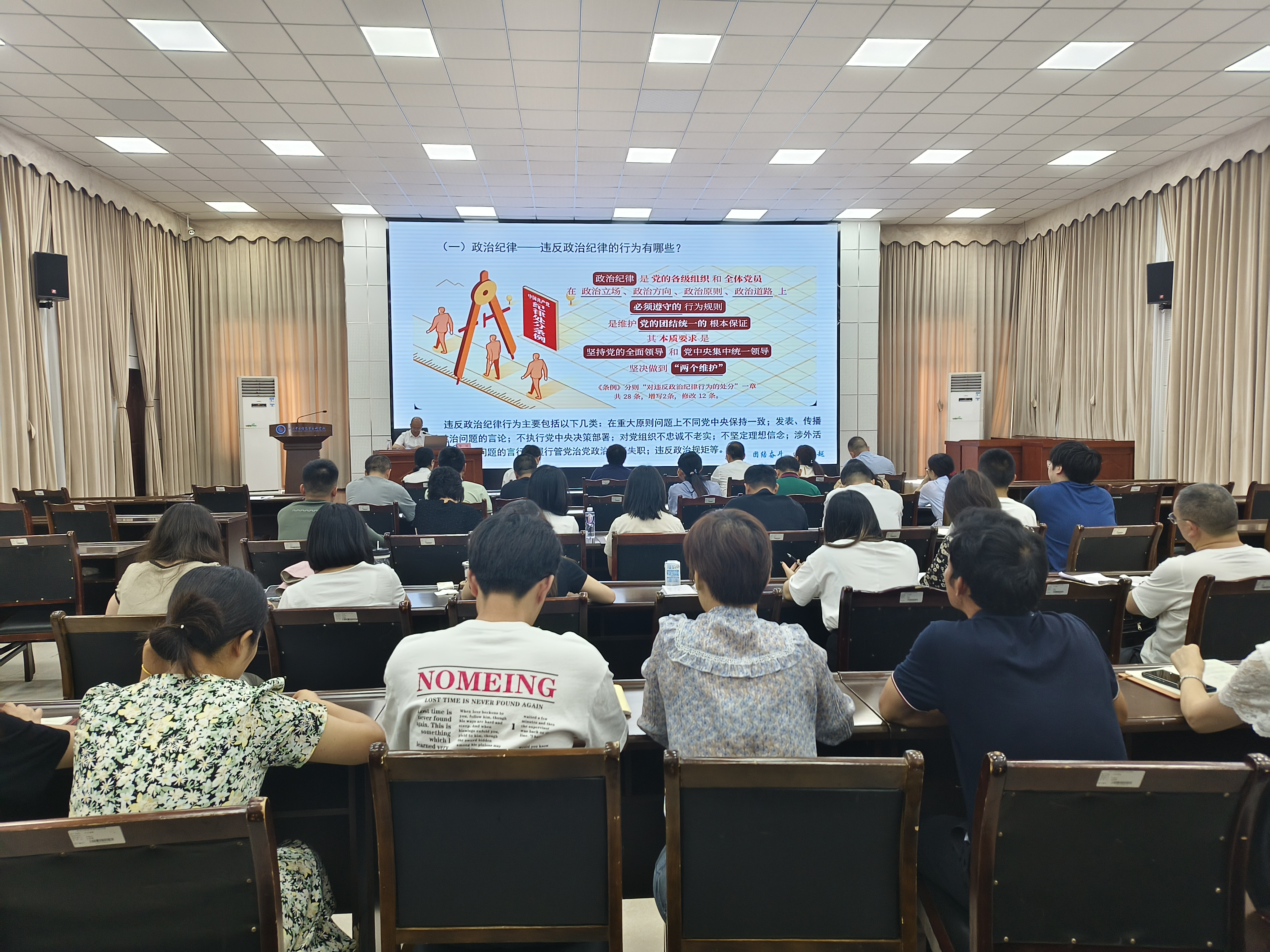 李祥校长的专题党课围绕对修订《中国共产党纪律处分条例》(以下简称《条例》)的认识体会、对照《条例》全面检视风险隐患、以学促改,抓好《条例》的贯彻落实等方面展开,深刻阐述习近平总书记关于全面加强党的纪律建设的重要论述,深刻阐明了纪律教育的重大意义和主要内容,强调纪律建设的治本作用,剖析党员干部违反“六项纪律”的典型案例,分享自身学习《条例》的所感所悟。