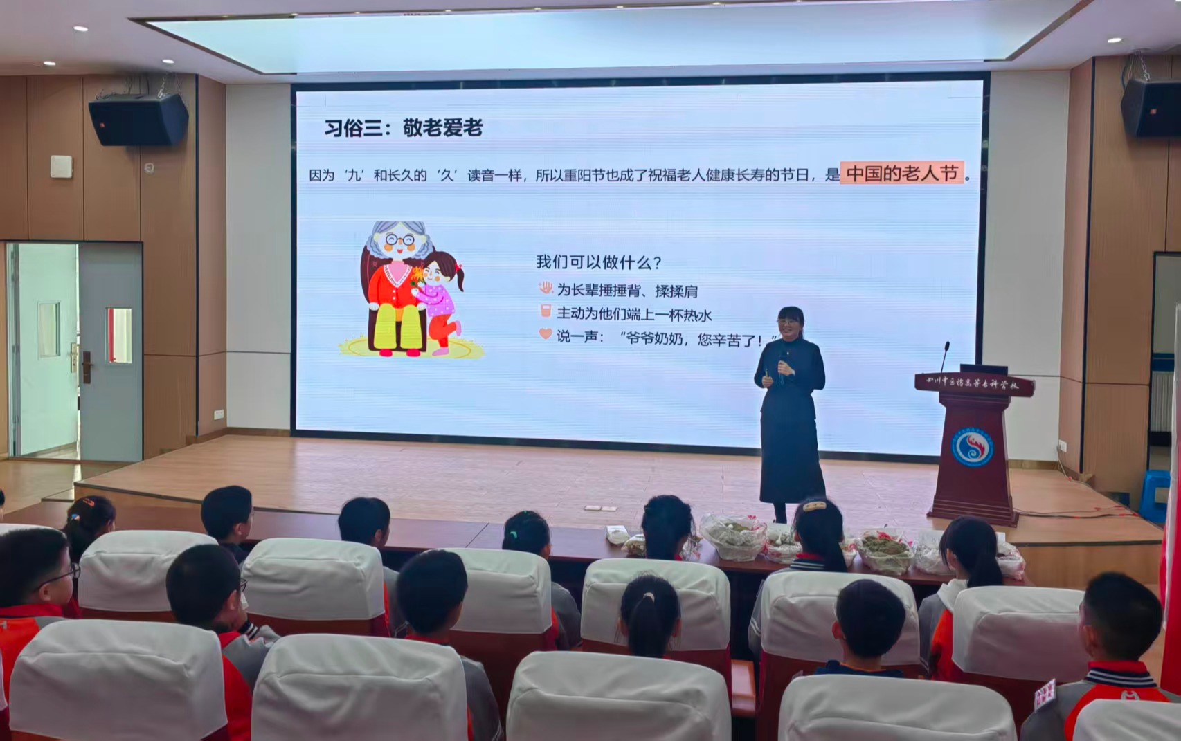 在香囊制作环节,林秋霞老师以“重阳节—登高敬老与神奇香囊”为主题,将中医药知识与孝亲敬老的中华美德巧妙融合,向小学生们讲解了重阳节佩戴香囊的习俗与中医药防病保健的原理,展示了香囊的整个制作流程,还亲自指导孩子们亲手完成香囊的制作。一针一线、一药一香,孩子们在劳动中感受中医药的实用与魅力,也在潜移默化中加深了对传统文化和民族精神的认同。孩子们纷纷表示:我一定要把自己制作的香囊带回去送给我的爷爷奶奶,希望他们身体健康。