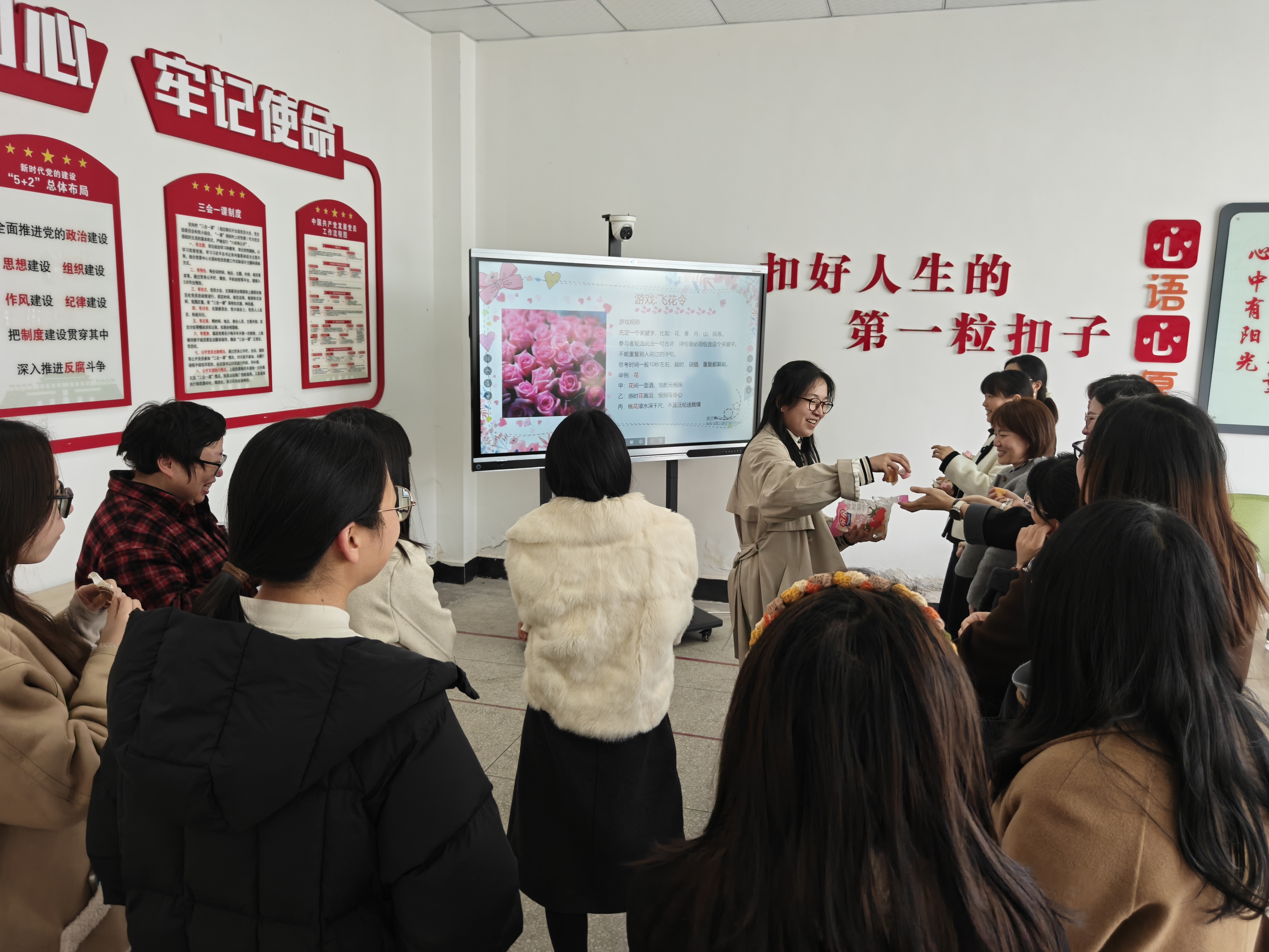 本次活动以中华传统文化为核心,设置了飞花令对决、看表情包猜成语两大趣味互动环节,将知识性与娱乐性巧妙融合,让女教职工们在轻松愉悦的氛围中感受传统文化魅力。飞花令对决环节,以“花”“春”“月”等经典诗词意象为关键词,女教职工们轮番应答、妙语连珠,从“人面不知何处去,桃花依旧笑春风”到“春江潮水连海平,海上明月共潮生”,一首首经典诗词脱口而出,充分展现了扎实的文化底蕴和敏捷的思维反应,现场掌声此起彼伏。看表情包猜成语环节,生动有趣的表情包组合激发了大家的抢答热情,“全心全意”“马到成功”“手舞足蹈”等成语被接连精准猜出,欢声笑语不断,现场气氛持续升温。为感谢大家的积极参与,每一位答对问题的教职工都获得了精心准备的零食礼包,贴心的奖励让大家在收获欢乐的同时,更感受到了工会的暖心关怀。