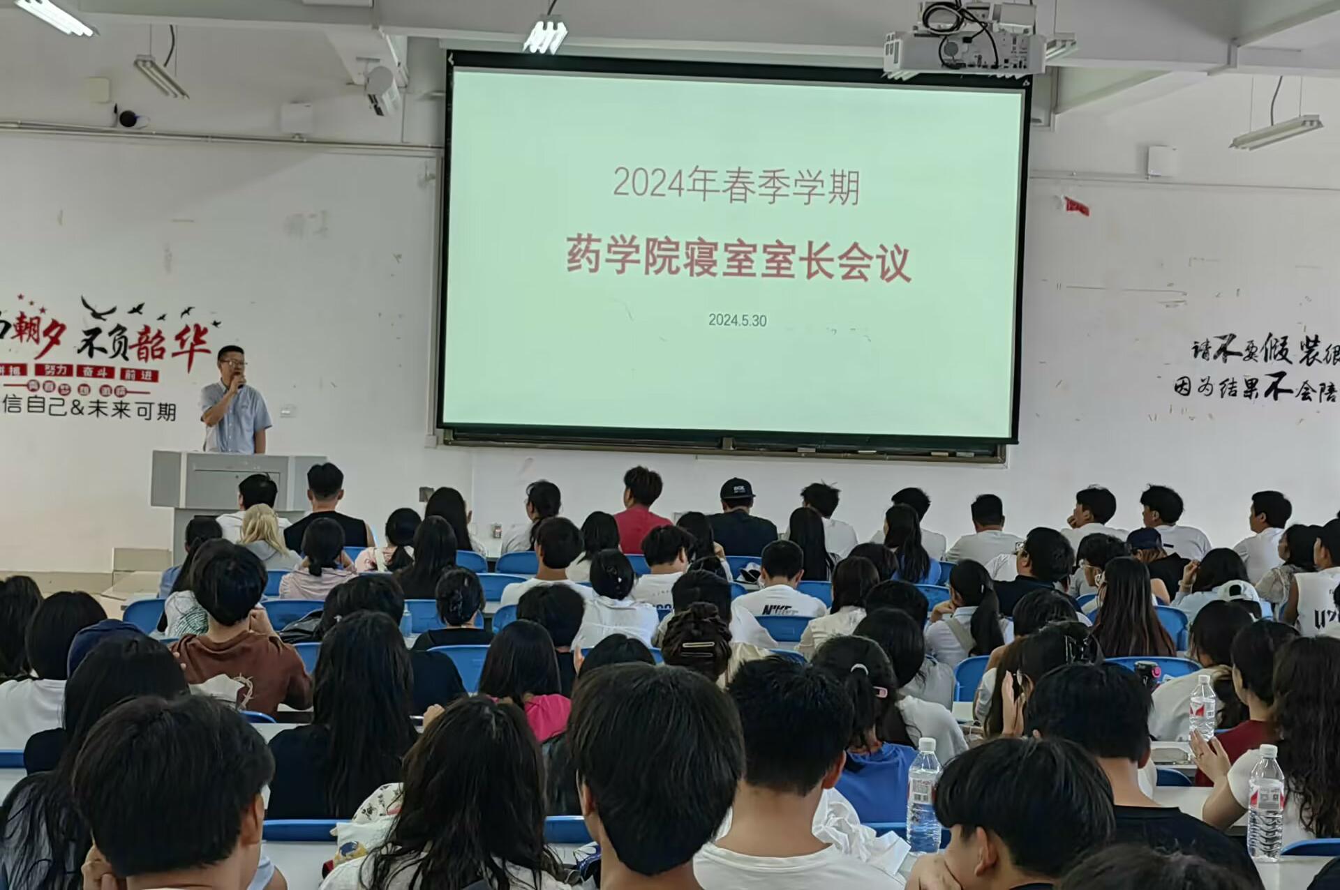 为落实《关于全面加强和改进新时代学校卫生与健康教育工作的意见》,全面提升我院全体学生文明素养和行为规范。2024年5月30日,学院组织全体寝室长在北区1-2-1教室召开“药学院寝室长会议”。会议由党总支书记任植艺主持,药学院党总支副书记孔丽、在校班级辅导员出席会议,200余名学生参会。